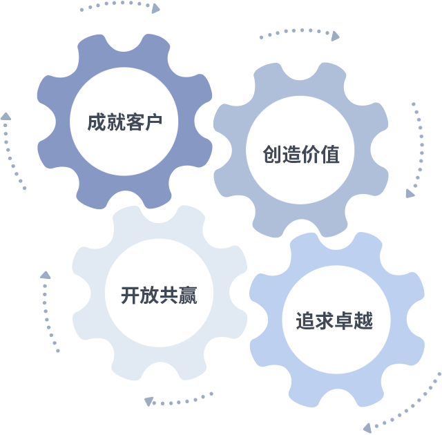 成就客户是一切决策的出发点,,,创造价值是衡量所有工作的标准,,,追求卓越是我们做事做人的态度,,开放共赢是我们的格局也是最终的结果。。价值观的齿轮环环相扣,,,,推动着组织里的每个人不断向前。。。。