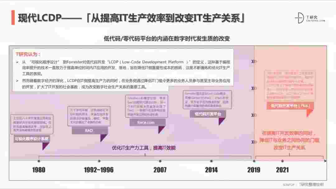 2020年前后,,,,,,,,,源于提高IT工作者开发效能的LCDP不断进化和衍生,,,,,,,面对业务导向日益明显的数字化变革。。。。。。。LCDP衍生出了面向不同对象的升级服务——面向专业人群的LCDP和业务人群的NCDP,,,,,LCDP与NCDP的不同服务属性被逐渐认可和接受。。。。。。。。。。。。。。。 LCDP在提高IT开发效率的同时,,,,,,,,,,,降低IT与业务之间协同的门槛改变IT生产关系。。。。。。。。。。。。