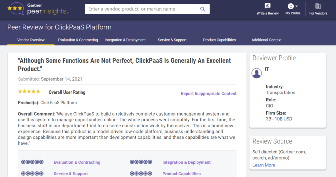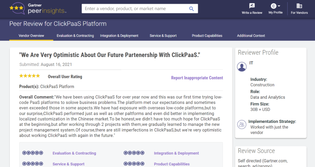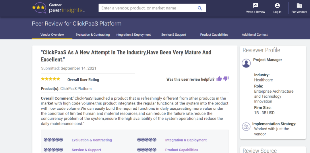 Tips:::::::::::【Peer Insights】——用户对企业IT产品和服务发布真实评价的平台。。。。。。目前已有355个市场,,,,,,,255,000条经过验证的评价。。。。。。。。。。。每一条评价Gartner会针对参评企业营收规模及参评人员信息做验证、、、、、、、评价内容做多维核实。。。。。。。。